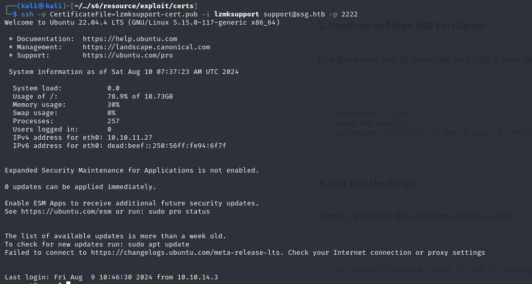 ssh -o CertificateFile=lzmksupport-cert.pub -i lzmksupport support@ssg.htb -p 2222