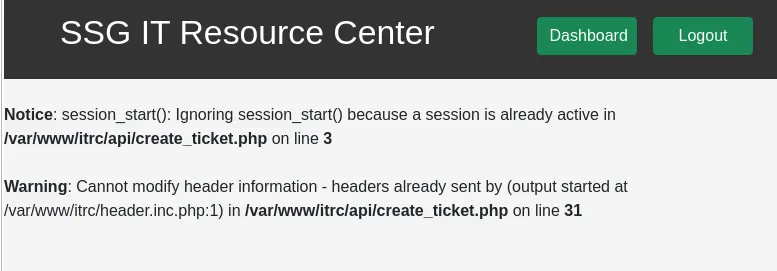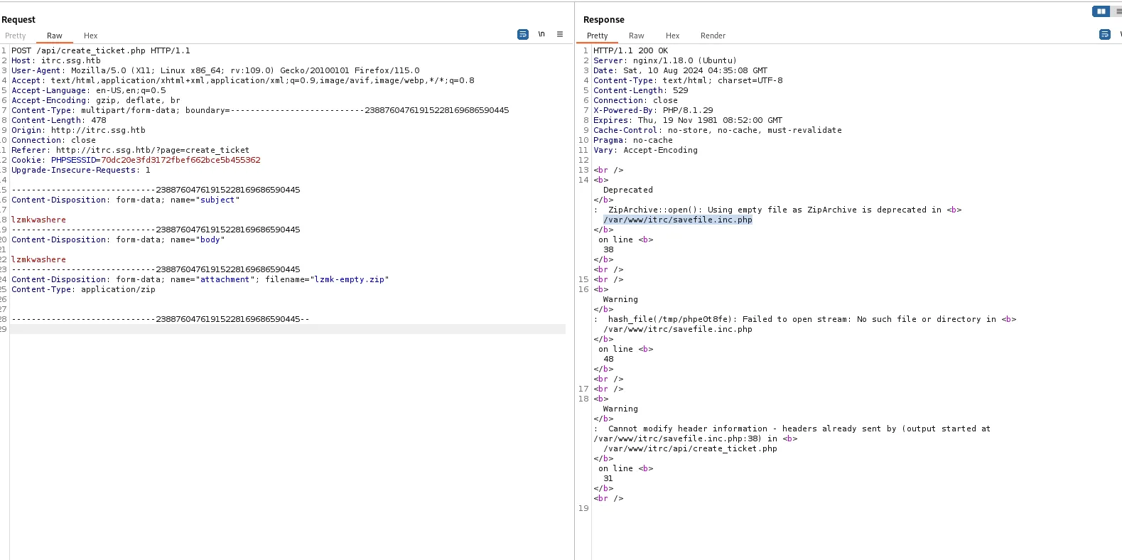<br /><b>Deprecated</b>: ZipArchive::open(): Using empty file as ZipArchive is deprecated in <b>/var/www/itrc/savefile.inc.php</b> on line <b>38</b><br /><br /><b>Warning</b>: hash_file(/tmp/phpe0t8fe): Failed to open stream: No such file or directory in <b>/var/www/itrc/savefile.inc.php</b> on line <b>48</b><br /><br /><b>Warning</b>: Cannot modify header information - headers already sent by (output started at /var/www/itrc/savefile.inc.php:38) in <b>/var/www/itrc/api/create_ticket.php</b> on line <b>31</b><br />visit http://itrc.ssg.htb/?page=/var/www/itrc/api/create_ticket