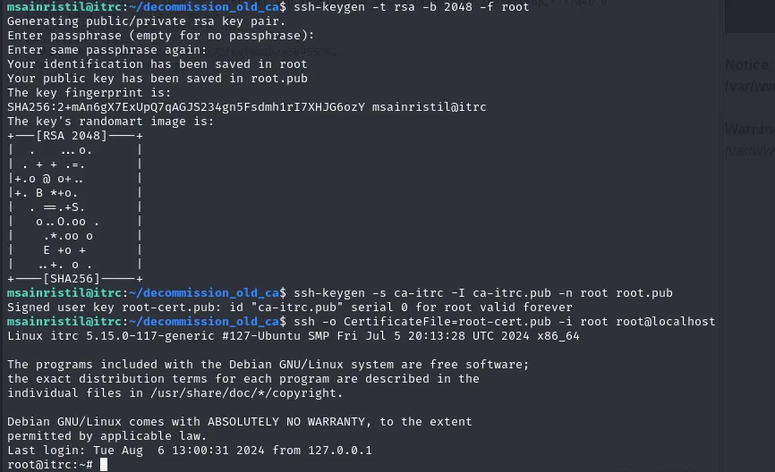 ssh-keygen -s ca -z 200 -I root -V -10w:forever -n root_user root.pubSSH into the target machine as root with newly minted key