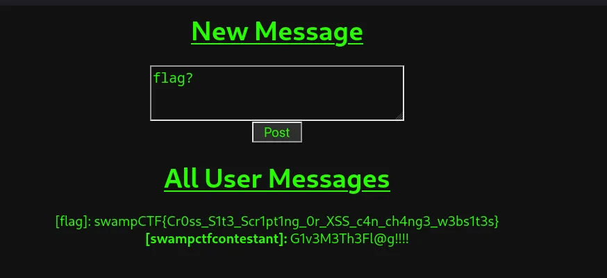 function App() { _s(); const defaultValue = ""; const [currentMessage, setMessageBoxValue] = react__WEBPACK_IMPORTED_MODULE_2___default().useState(defaultValue); const [flagGoesHere, setFlagValue] = (0,react__WEBPACK_IMPORTED_MODULE_2__.useState)(""); const divRef = react__WEBPACK_IMPORTED_MODULE_2___default().useRef(null); const [lotteryNumber, setLotteryNumber] = (0,react__WEBPACK_IMPORTED_MODULE_2__.useState)(5); const [totalNumbers, setTotalNumber] = (0,react__WEBPACK_IMPORTED_MODULE_2__.useState)(100); var printFlagSetup = document.getElementById("flagstuff"); console.log("Flag Will Be Checked"); function addNewMessages(event) { event.preventDefault(); if (currentMessage != "") { if (printFlagSetup != undefined) { printFlagSetup.setAttribute("code", ""); } addNewMessageChance(); divRef.current.innerHTML = "<b>[swampctfcontestant]: </b>" + currentMessage + "<br>" + divRef.current.innerHTML; addNewMessageChance(); setMessageBoxValue(defaultValue); } } function addNewMessageChance() { var willTypeMessage = Math.floor(Math.random() * totalNumbers); if (willTypeMessage <= lotteryNumber) { divRef.current.innerHTML = (0,_Messages_tsx__WEBPACK_IMPORTED_MODULE_3__.returnRandomResponses)() + divRef.current.innerHTML; willTypeMessage = Math.floor(Math.random() * 100); } } function updateMessageBox(newTextBoxValue) { setMessageBoxValue(newTextBoxValue); addNewMessageChance(); } async function checkCode() { if (printFlagSetup != undefined) { console.log(printFlagSetup.getAttribute("code")); if (printFlagSetup.getAttribute("code") === "G1v3M3Th3Fl@g!!!!") { const flag = await (0,_Messages_tsx__WEBPACK_IMPORTED_MODULE_3__.getFlag)(); setFlagValue("[flag]: " + flag); } } } checkCode(); return...);set code attribute to whatever is expected: